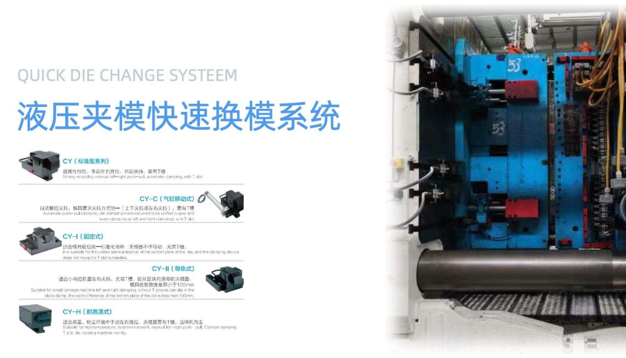 公司主要生產(chǎn)注塑機(jī)快速換模系統(tǒng)、壓鑄機(jī)快速換模系統(tǒng)、沖床快速換模系統(tǒng)、油壓機(jī)快速換模系統(tǒng)、合模機(jī)快速換模系統(tǒng)。 我公司努力研究、優(yōu)化機(jī)器換模生產(chǎn)的自動(dòng)化、省力化之各式快速換模系...